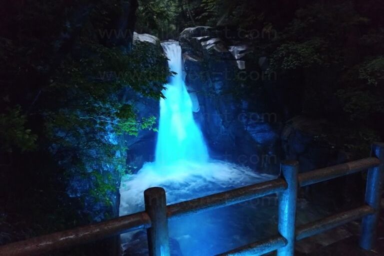 ↑ 落差12mの天然の滝をLED PARライトで照射 ↑